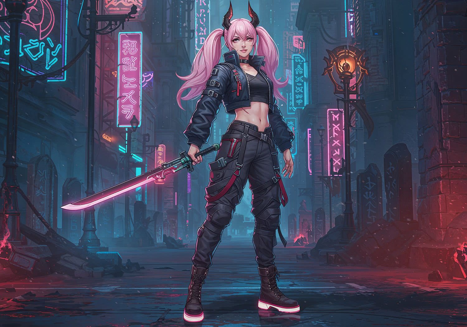 videogame screenshot, action capture screen, extreme dynamic poses, vibrant videogame color palette: A dynamic digital illustration of a female RPG character in a hybrid anime-Western fantasy style, standing in a neon-lit cyberpunk cityscape blended with dark fantasy ruins, embodying the 2020-2025 anime fashion influence on Western games. She wears an asymmetrical outfit: a cropped jacket with one long sleeve featuring black stripes and metal buckles on the shoulder, the other side sleeveless and adorned with pink kawaii ribbons; high-waisted pants with uneven hems, one leg covered in layered straps and buckles, the other loose and flowing; combat boots with glowing accents. Her design mixes cute elements like large expressive eyes, pastel pink hair in twin tails, and soft facial features with gritty details: demonic horns, scarred skin, and a fiery aura suggesting inner conflict. Pose her confidently mid-stride, holding a futuristic sword, with subtle nods to games like Cyberpunk 2077 and Baldur’s Gate 3 in the background—neon signs and ancient runes. Art style: vibrant anime-inspired cel-shading with realistic proportions and detailed textures, in a color palette of neon blues, pinks, and deep shadows for an immersive, revolutionary fusion of kawaii charm and mroczny fantasy grit. High resolution, epic composition. ;;Image without icons or texts. Style: videogame screenshot, action capture screen, clean digital coloring with sharp highlights, high energy and contrast.