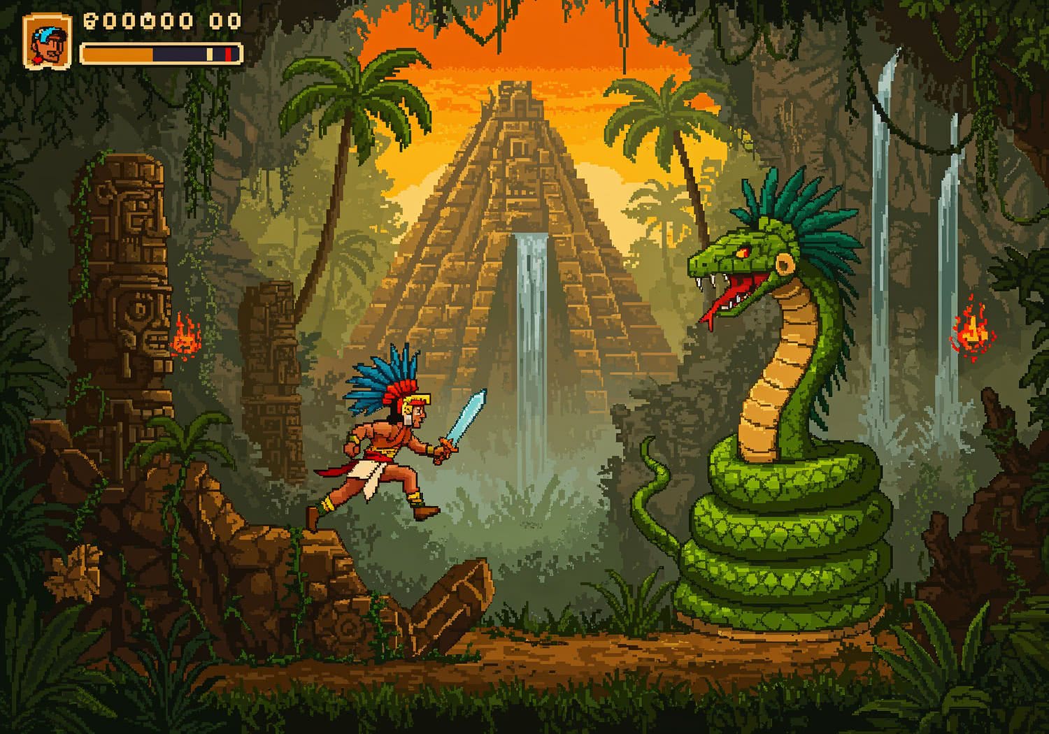Retro game and console pixelart illustration: A vibrant retro pixel art illustration in 8-bit style inspired by 1980s Sega Master System graphics, featuring a brave Aztec warrior hero named Izel, dressed in a feathered headdress and loincloth, wielding a glowing sword and dagger, as he explores a dense, lush jungle path leading to an ancient towering pyramid temple. In the foreground, Izel leaps over vine-covered ruins and traps, battling a massive coiled serpent boss with fiery eyes emerging from the foliage. Background shows misty Aztec motifs like stone carvings of Quetzalcoatl the feathered serpent god, hidden caves, and parallax scrolling layers of palm trees and waterfalls under a golden sunset sky, evoking mystery, adventure, and mythical exploration with a 16-color palette of greens, golds, reds, and blues. ;;Use a retro video game screenshot style, retro vivid color palette, retro pixel-art elements.