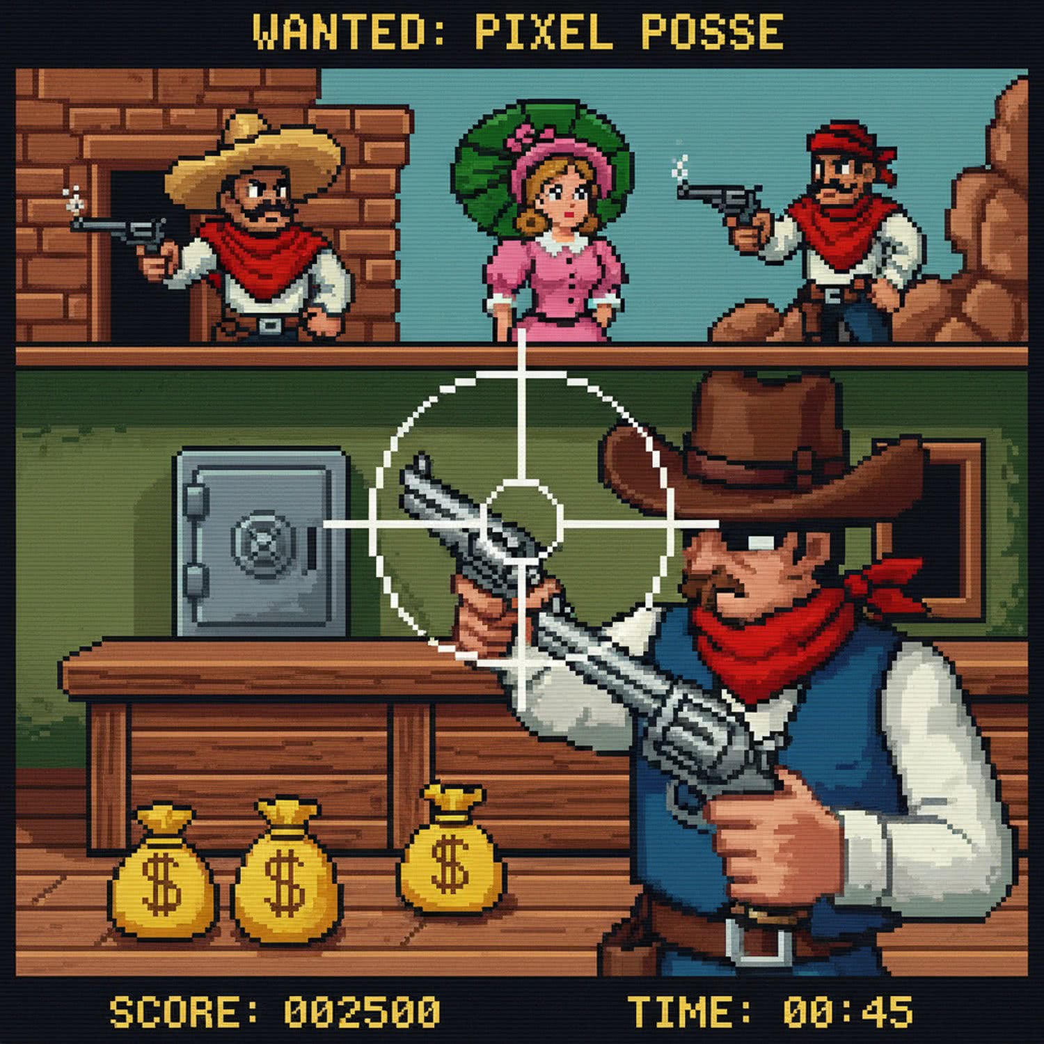Retro game and console pixelart illustration: A pixel art illustration in 8-bit retro style inspired by 1980s Sega SG-1000 graphics, featuring a cowboy sheriff in a hat standing behind a wooden bank counter with a safe in the background, aiming a revolver cursor through three divided screen windows: bandits in sombreros emerging from the left and right windows with guns drawn, an innocent lady with parasol in the middle window, tense Wild West atmosphere with golden sacks of money on the floor, simple color palette of 16 colors, low resolution 256×192 feel, dynamic action pose emphasizing quick-draw shooting. ;;Use a retro video game screenshot style, retro vivid color palette, retro pixel-art elements.