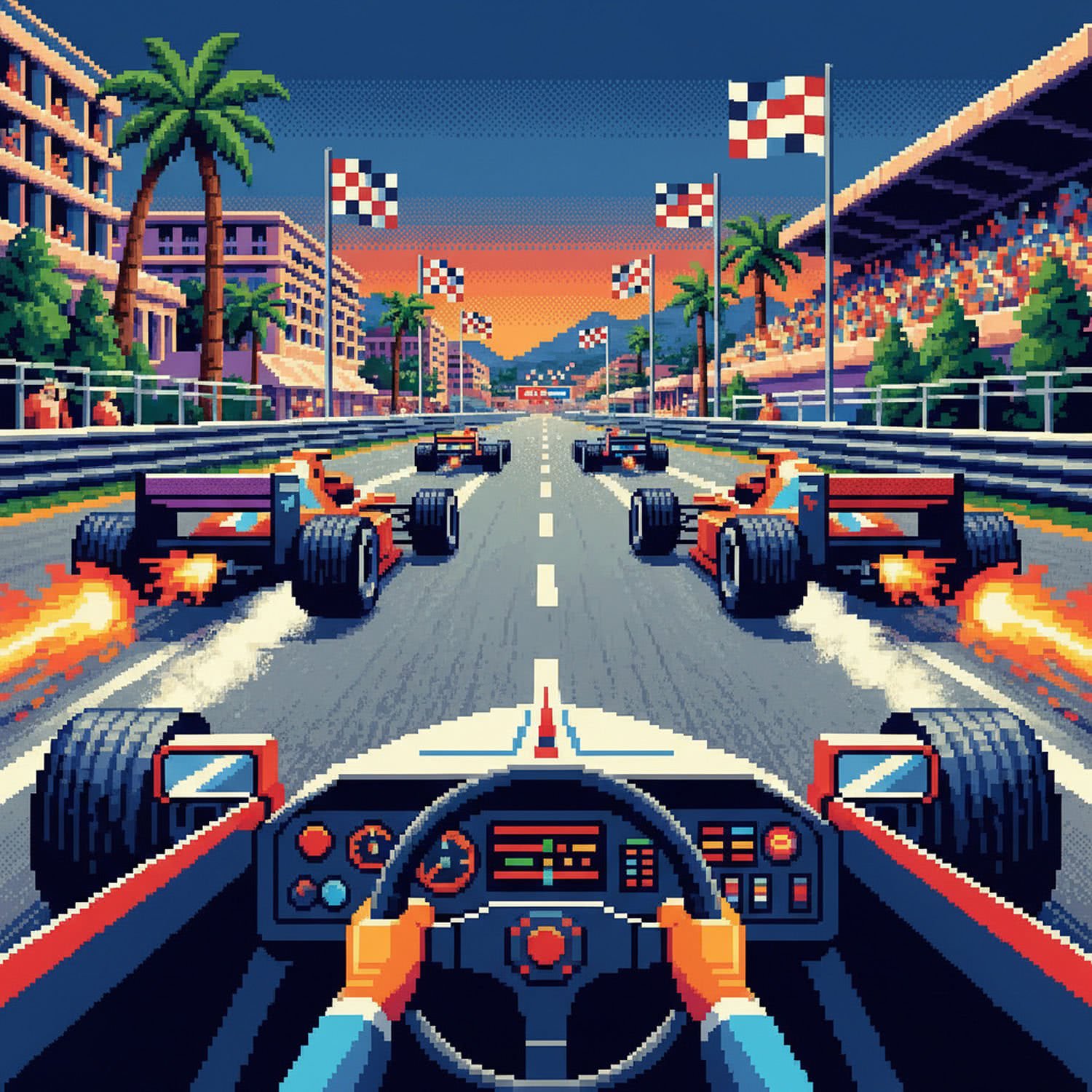 Retro game and console pixelart illustration: A dynamic first-person cockpit view of a Formula 1 race car speeding around a winding Monaco-inspired track at dusk, with vibrant colorful pseudo-3D graphics in retro 16-bit style, showing rival cars blurring past, checkered flags waving in the distance, detailed barriers and cheering crowds, engine flares and tire smoke for high-speed immersion, evoking the Atari Lynx handheld console’s revolutionary color display. ;;Use a retro video game screenshot style, retro vivid color palette, retro pixel-art elements.