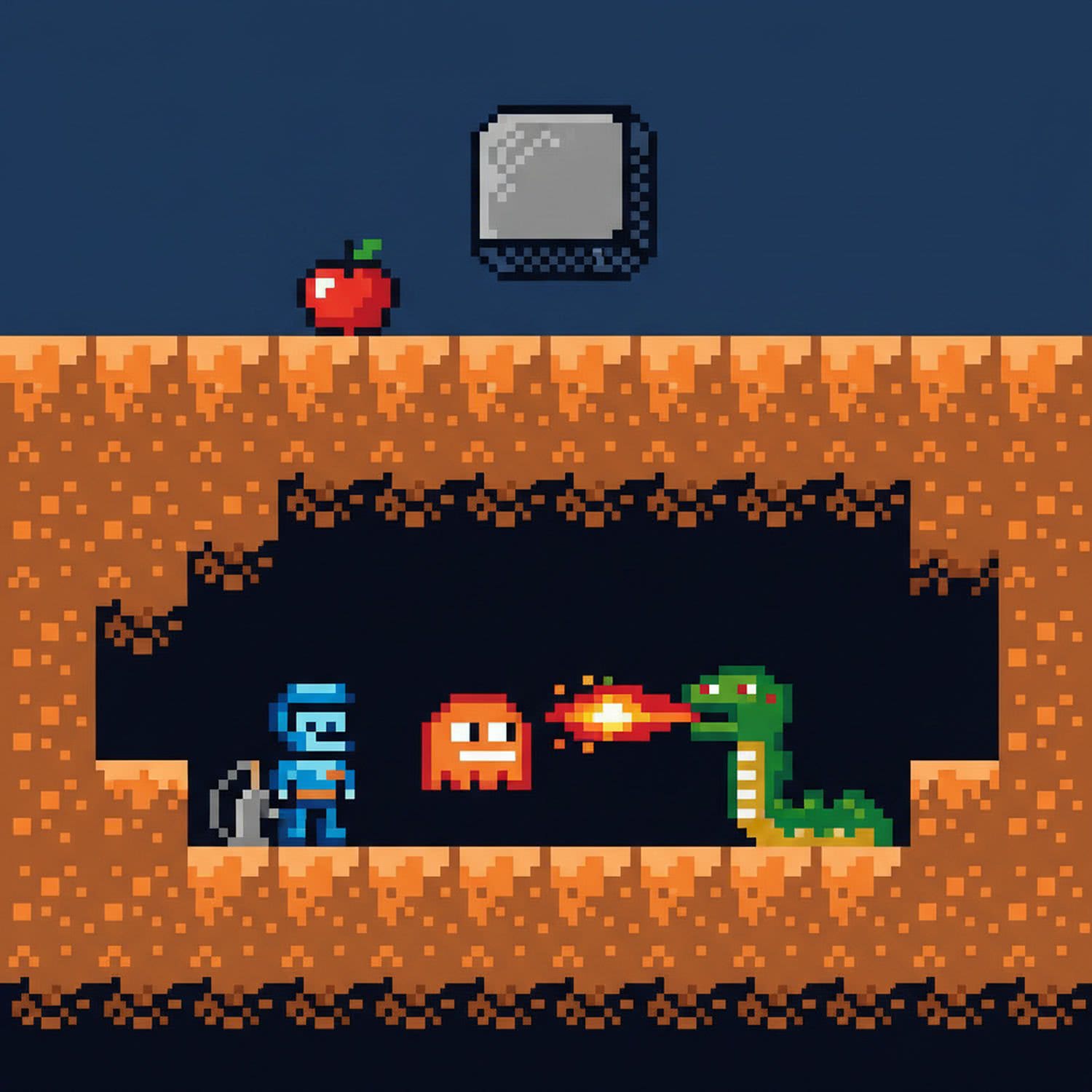 Retro game and console pixelart illustration: A retro pixel art illustration in the style of Atari 2600 graphics, depicting the Dig Dug game scene: a small blue Dig Dug character in a spacesuit holding a pump, digging a black tunnel through brown and orange pixelated earth underground. Nearby, an orange Pooka ghost-like enemy floats menacingly, and a green Fygar dragon enemy breathes fire. A large gray rock hovers above, ready to drop, with simple bonus fruit like an apple on the surface. Low-resolution 160×192 pixel aesthetic, vibrant limited color palette of 4 colors per line, evoking 1980s arcade nostalgia. ;;Use a retro video game screenshot style, retro vivid color palette, retro pixel-art elements.