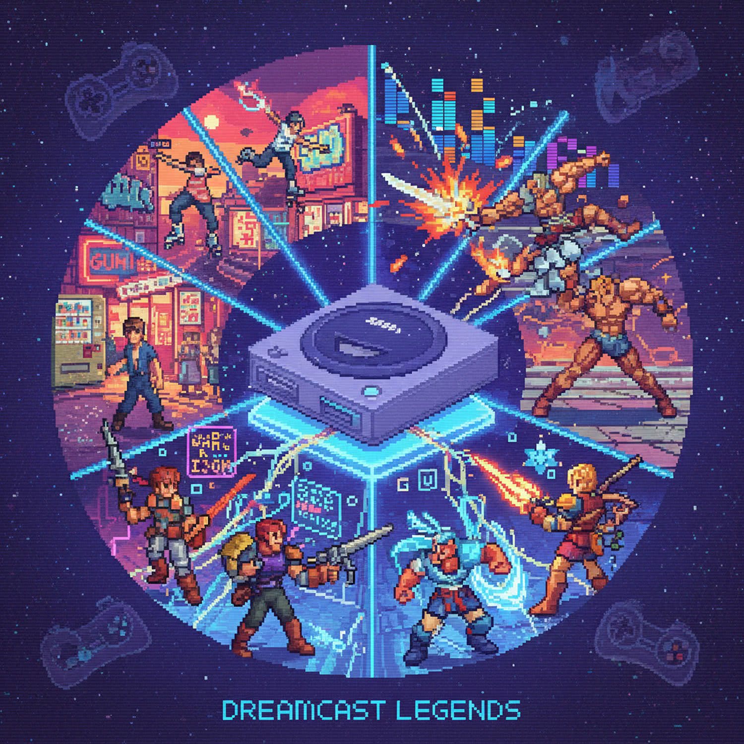 Retro game and console pixelart illustration: A vibrant retro-futuristic illustration of the Sega Dreamcast console prominently centered on a glowing pedestal, surrounded by dynamic scenes from its iconic games: in the foreground, diverse characters from Phantasy Star Online battling sci-fi monsters in a multiplayer online lobby with ethereal data streams; to the left, Ryo Hazuki from Shenmue walking through a detailed 1980s Japanese street at dusk with NPCs and vending machines; on the right, intense 3D fighters from Soulcalibur clashing with weapons in an arena, mid-motion with flying polygons; in the background, cel-shaded rollerbladers from Jet Set Radio spraying graffiti on urban walls while evading police, and abstract rhythmic energy waves from Rez pulsing with synesthetic colors and vibrations. The overall style is a mix of 90s pixel art and high-contrast 3D rendering, evoking innovation and nostalgia, with a starry digital sky and faint controller silhouettes. ;;Use a retro video game screenshot style, retro vivid color palette, retro pixel-art elements.