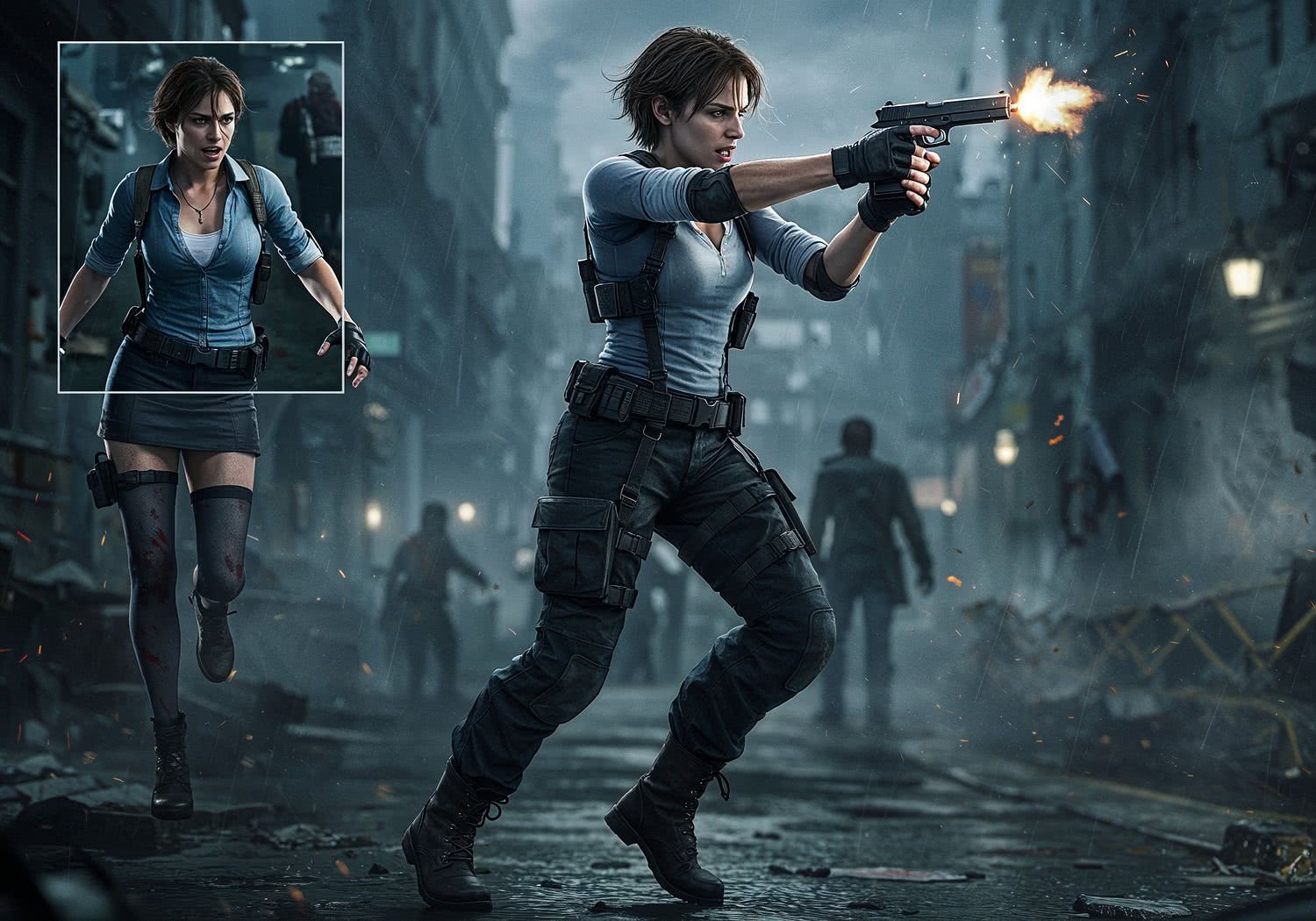 videogame screenshot, action capture screen, extreme dynamic poses, vibrant videogame color palette: Create a highly detailed digital illustration in a realistic, cinematic style inspired by the Resident Evil 3 remake’s RE Engine graphics, with dark, atmospheric lighting, muted blues and grays, and subtle horror elements like rain-slicked streets and distant zombie silhouettes in a ruined Raccoon City. Depict Jill Valentine as the central figure in a dynamic action pose, mid-sprint while turning to fire her handgun over her shoulder at an approaching Nemesis in the background, emphasizing her determination and survival prowess. She wears her updated tactical outfit: loose black cargo pants with multiple pockets tucked into heavy combat boots, a white long-sleeve shirt layered under an open blue tactical jacket with rolled sleeves, black gloves, and a shoulder holster; her short brown hair is windswept, expression fierce and focused. To the side, subtly include a semi-transparent overlay or inset image of her original 1999 outfit—blue short-sleeve blouse, white tank top, black mini skirt, stockings, and heels—for contrast, symbolizing evolution from impractical to practical design. High contrast shadows, volumetric fog, and gritty textures to evoke survival horror immersion. ;;Image without icons or texts. Style: videogame screenshot, action capture screen, clean digital coloring with sharp highlights, high energy and contrast.
