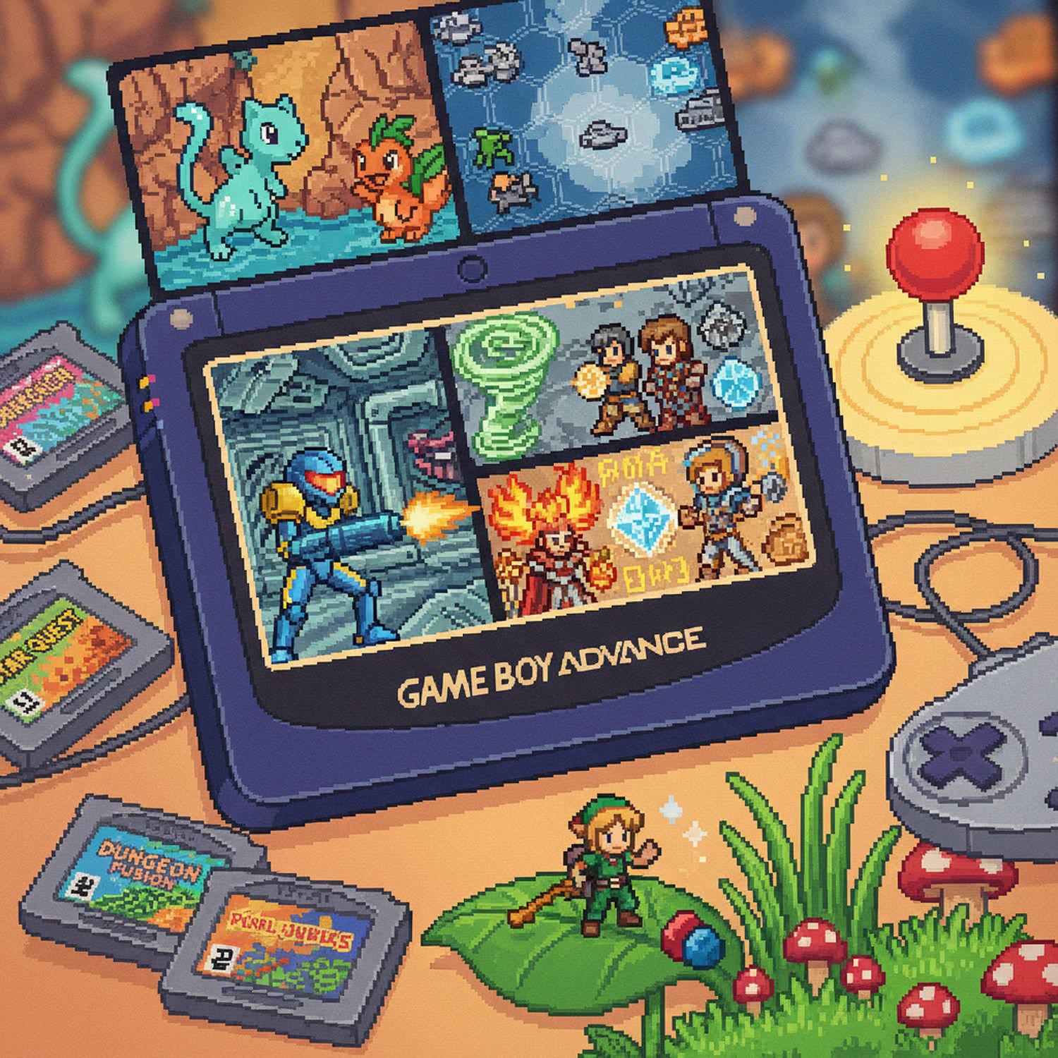 Retro game and console pixelart illustration: A vibrant, nostalgic illustration of a classic Game Boy Advance handheld console in the foreground, screen glowing with colorful pixel art from its iconic games: a Pokémon battle scene with Ruby/Sapphire creatures like a shiny Mew emerging from water, a tactical Advance Wars battlefield with units and fog of war, Samus Aran in her suit exploring a sci-fi station from Metroid Fusion, elemental Psynergy magic swirling around adventurers in Golden Sun, and a miniaturized Link from The Legend of Zelda: The Minish Cap fusing items in a lush Hyrule landscape. Surround the console with subtle retro gaming elements like cartridges, a joystick, and faint joystick glow, in a 2D pixel art style evoking early 2000s handheld innovation, warm nostalgic tones, high detail, dynamic composition. ;;Use a retro video game screenshot style, retro vivid color palette, retro pixel-art elements.