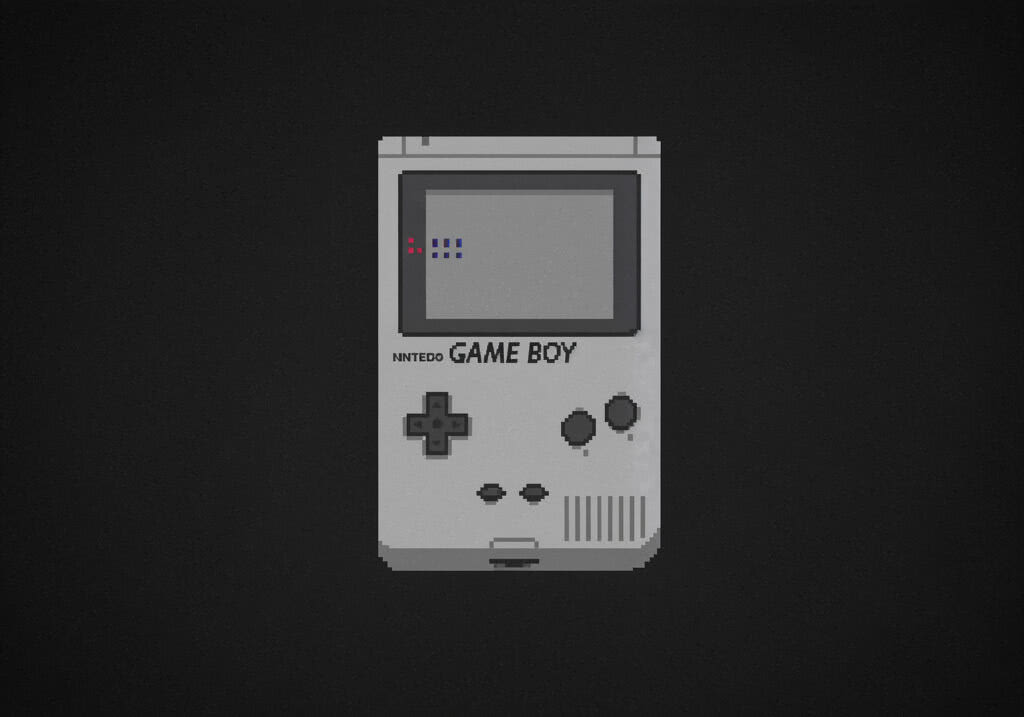 Retro game and console pixelart illustration: A highly detailed, retro-style illustration of the original Nintendo Game Boy console logo, rendered in pixel art mimicking the 1989 handheld’s monochrome LCD screen aesthetic with 4 shades of gray, centered prominently on a subtle dark background to evoke nostalgia, exact font and design faithful to the classic „GAME BOY” branding without any additional elements, text, or icons. ;;Use a retro video game screenshot style, retro vivid color palette, retro pixel-art elements.