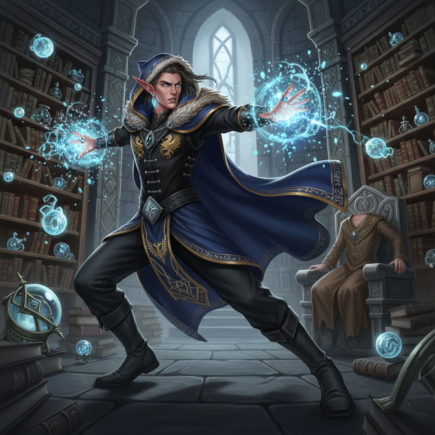 videogame screenshot, action capture screen, extreme dynamic poses, vibrant videogame color palette: A highly detailed digital illustration in a vibrant fantasy art style inspired by modern RPG games like World of Warcraft and Skyrim, depicting a confident male elf wizard standing in an ancient stone tower library filled with glowing tomes and arcane artifacts. He wears a sleek, flowing dark blue cloak with embroidered golden runes and fur-trimmed hood, layered over a fitted black vest adorned with silver buttons and guild symbols, paired with subtle jewelry including a glowing mana ring on his finger, an obsydian amulet necklace, and crystal earrings that pulse with ethereal blue energy. His pose is dynamic, mid-spell-casting with one hand extended releasing sparkling magical particles, emphasizing practicality and prestige over traditional long robes—show a faded, archaic robe draped over a nearby chair in the background for contrast. Use a color palette of deep blues, golds, and silvers with dramatic lighting from floating orbs, evoking elegance, power, and social status in a virtual fantasy world. ;;Image without icons or texts. Style: videogame screenshot, action capture screen, clean digital coloring with sharp highlights, high energy and contrast.
