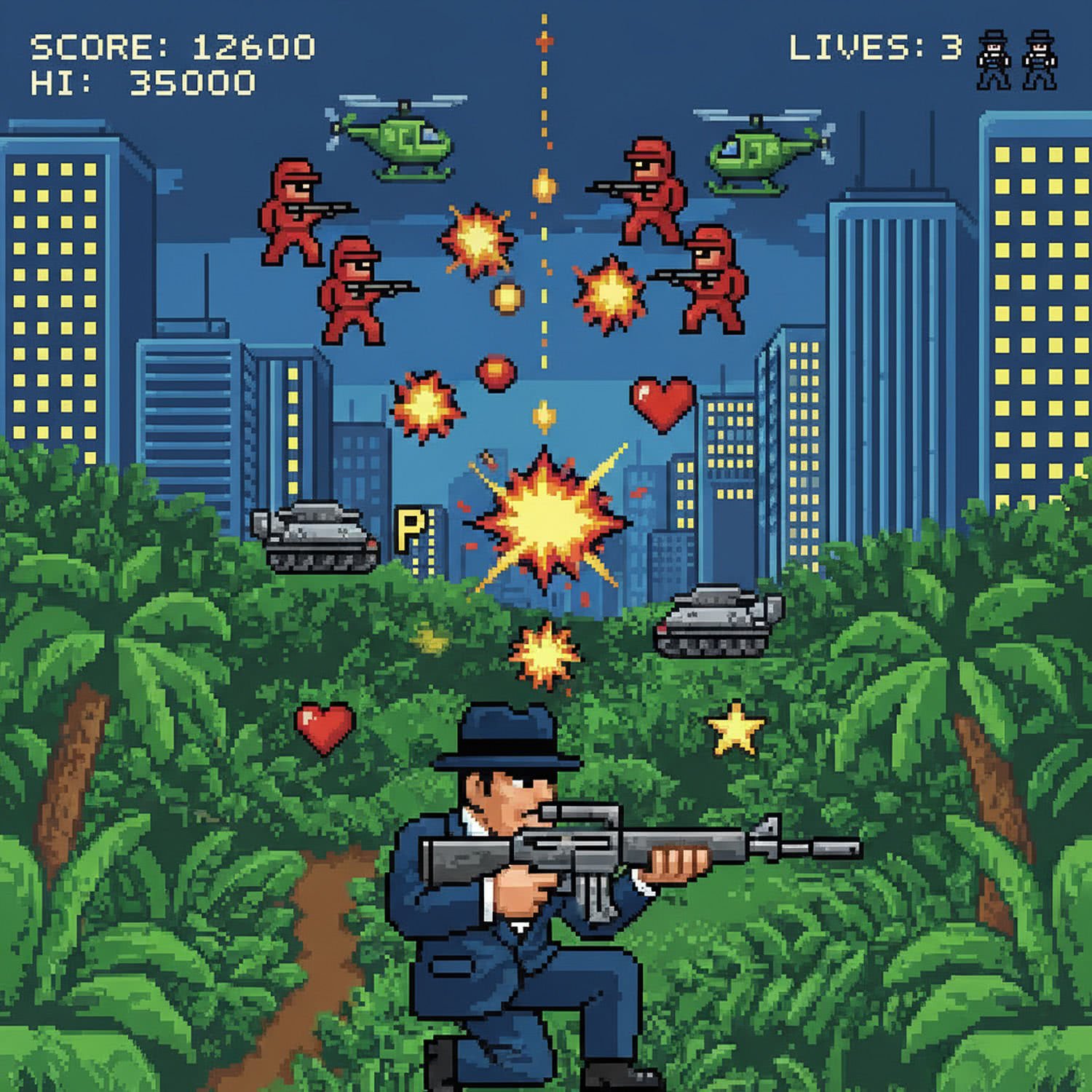 Retro game and console pixelart illustration: A pixel art illustration in 8-bit retro style inspired by 1980s Sega SG-1000 graphics, featuring the iconic sniper Golgo 13 at the bottom of a vertical scrolling screen, dressed in a dark suit and hat, aiming and firing his M16 rifle upward at waves of descending enemies including red soldiers with rifles, green helicopters, and tanks, with simple animated explosions, power-up icons falling, and backgrounds of jungle foliage or urban skyscrapers in limited 16-color palette, evoking classic vertical shooter gameplay. ;;Use a retro video game screenshot style, retro vivid color palette, retro pixel-art elements.