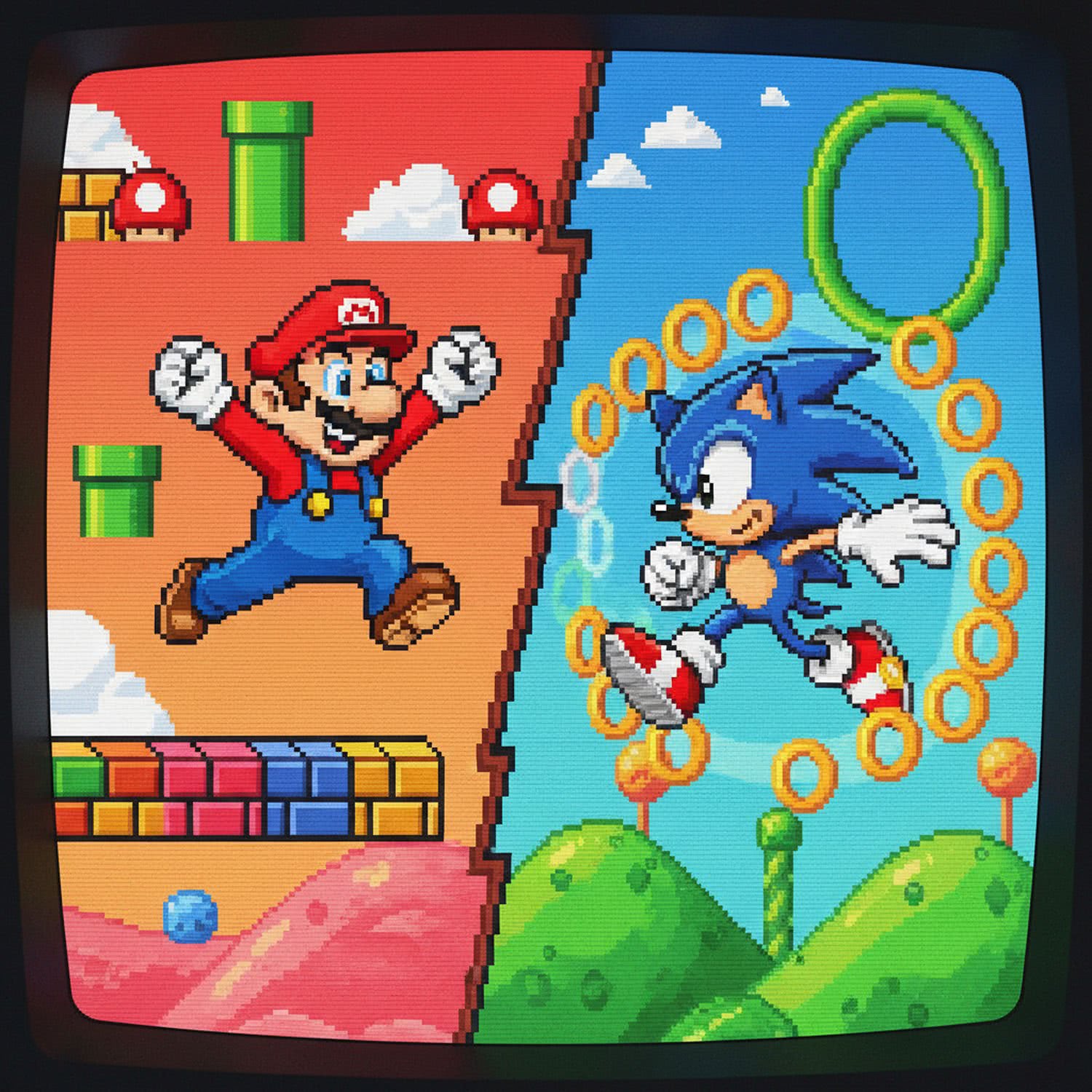 Retro 16bit game and 16bit console fanart: A dynamic retro-style illustration of Mario and Sonic facing off in an epic rivalry showdown, Mario leaping confidently in his red cap and overalls on colorful platform worlds with mushrooms and pipes, Sonic dashing at high speed as a blue hedgehog with red shoes and spinning rings in looping green hills, vibrant 16-bit inspired graphics, nostalgic 90s gaming atmosphere, intense energy and contrasting personalities, no text or icons. ;;Use a 16bit retro video game screenshot style, 16bit retro vivid color palette, 16bit retro pixel-art elements and CRT effects.