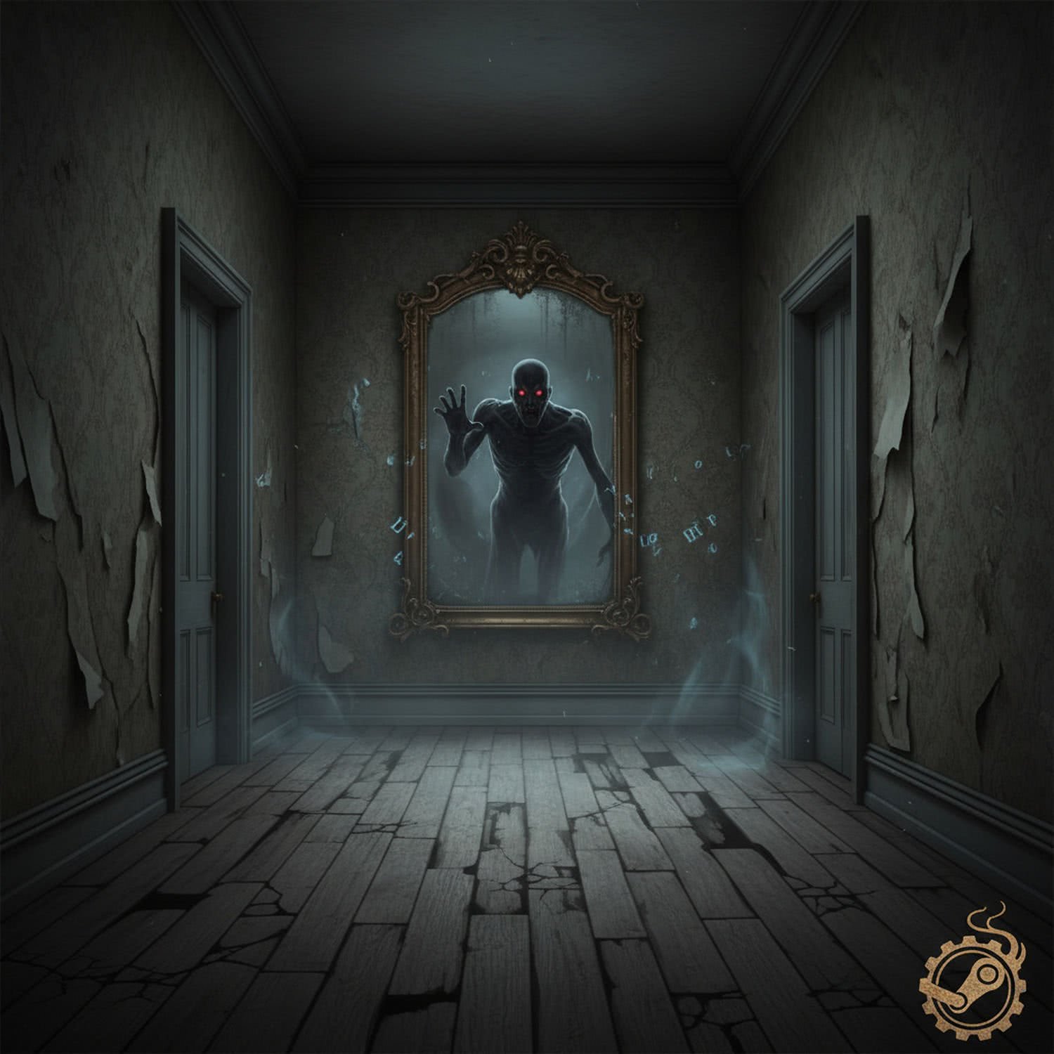 Video game screenshot artwork illustration: A dimly lit Victorian mansion hallway with cracked wooden floors and ornate wallpaper peeling at the edges, a large antique mirror dominating the center reflecting a shadowy figure approaching from behind the viewer in first-person perspective, the reflection showing a distorted doppelganger with glowing eyes emerging from the glass surface, subtle fog curling around the room’s corners and faint whispers visualized as ethereal wisps near the mirror, evoking psychological tension and illusion.