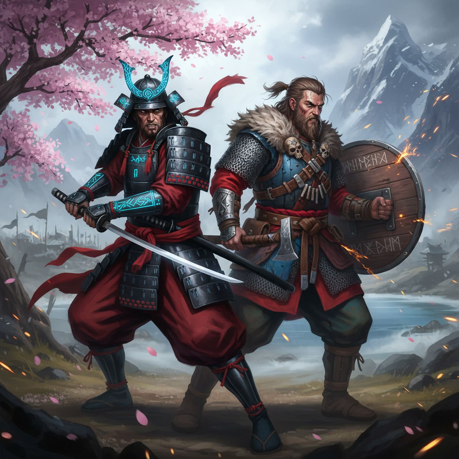 videogame screenshot, action capture screen, extreme dynamic poses, vibrant videogame color palette: A dynamic digital illustration depicting a fierce samurai warrior and a rugged Viking berserker standing back-to-back in a misty ancient battlefield blending feudal Japan and Norse landscapes, with cherry blossoms and fjords in the background. The samurai wears a traditional yoroi armor with layered iron plates and a flowing red hakama, but enhanced with subtle neon-glowing futuristic patterns on the kimono sleeves, dynamic fabric ripples in slow-motion wind, and a kabuto helmet adorned with symmetric digital runes that emit a soft blue light. The Viking dons a chainmail byrnia with fur-trimmed shoulders and leather belts, featuring vibrant crimson and azure accents on the woolen tunic, post-apocalyptic trophy straps, and particle spark effects around the edges as if struck in battle, with geometric minimalist runes etched on a wooden shield. Both characters have intense, heroic expressions, emphasizing the fusion of historical authenticity and modern gaming flair. Render in a cinematic video game art style, high-detail 4K realism with Unreal Engine-inspired lighting, vibrant colors, dramatic shadows, and subtle fantasy glows to evoke immersion and creativity. ;;Image without icons or texts. Style: videogame screenshot, action capture screen, clean digital coloring with sharp highlights, high energy and contrast.