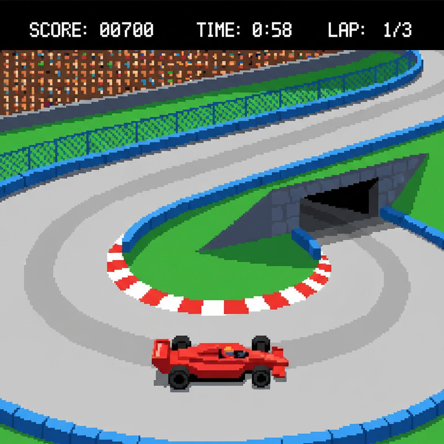 Retro game and console pixelart illustration: A retro pixel art illustration in 8-bit style depicting a top-down view of a red Formula 1 race car speeding along a simplified Monaco Grand Prix circuit on the Sega SG-1000 console, navigating tight turns with blue barriers, green grass verges, a hairpin bend, tunnel, and distant crowd sprites, evoking 1980s arcade racing nostalgia with limited color palette and blocky graphics. ;;Use a retro video game screenshot style, retro vivid color palette, retro pixel-art elements.