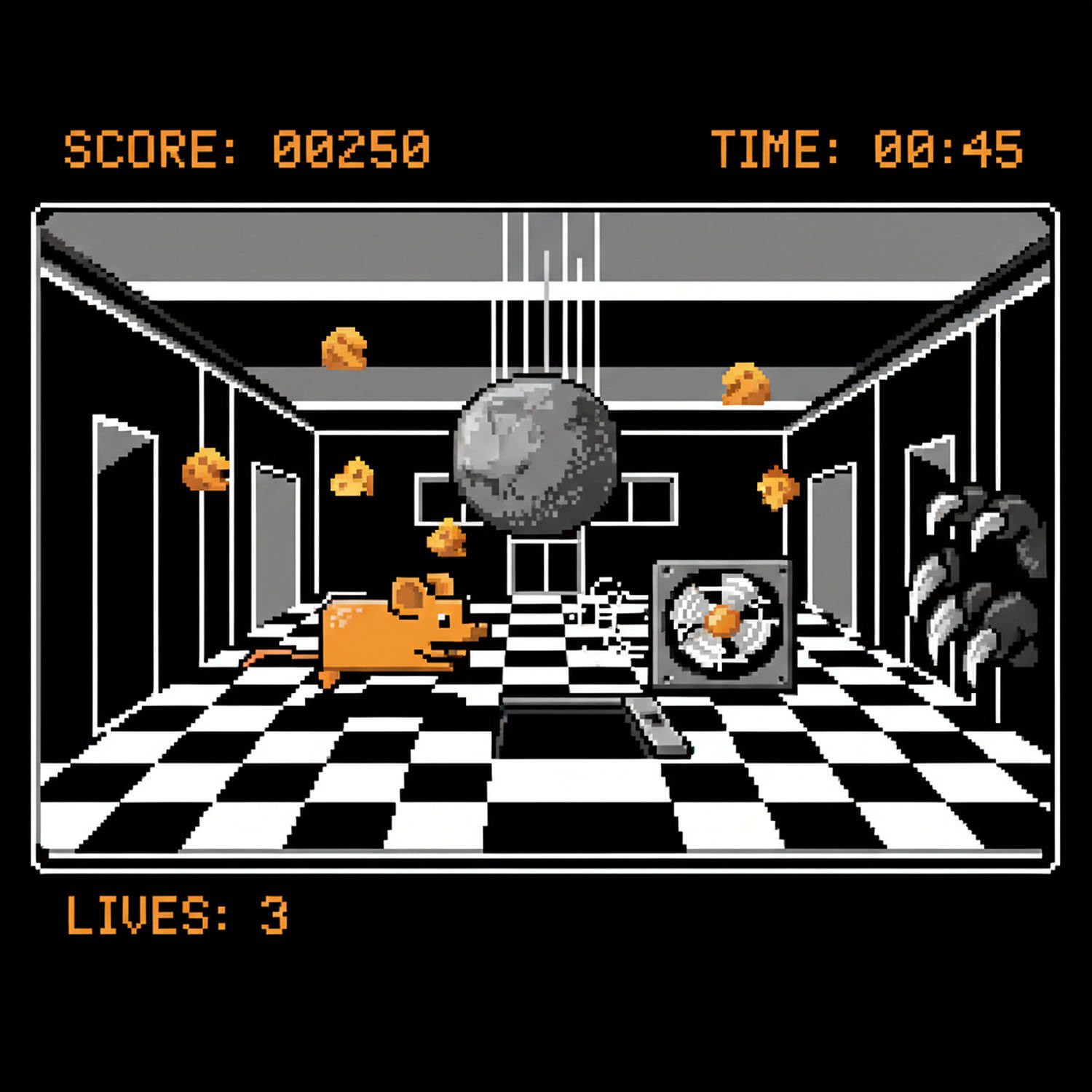 Pułapki to serce gry – inspirowane oryginałem, ale uproszczone. Spotkamy tu spadające głazy, które miażdżą mysz przy kontakcie; podłogę otwierającą się jak klapa, prowadzącą do przepaści; wirujące wentylatory ssące w pułapkę; a nawet kocie pazury wyłaniające się z narożników. Każda pułapka ma unikalny wzór pikseli: na przykład głaz to 8×8 sprite z szarymi gradientami, animowany przez TIA z prędkością 60 Hz. Gra używa kernelu programowego, customowego kodu optymalizującego rendering, co pozwala na płynny ruch przy ograniczonej mocy – mysz porusza się z prędkością 2 pikseli na klatkę, co daje uczucie napięcia.