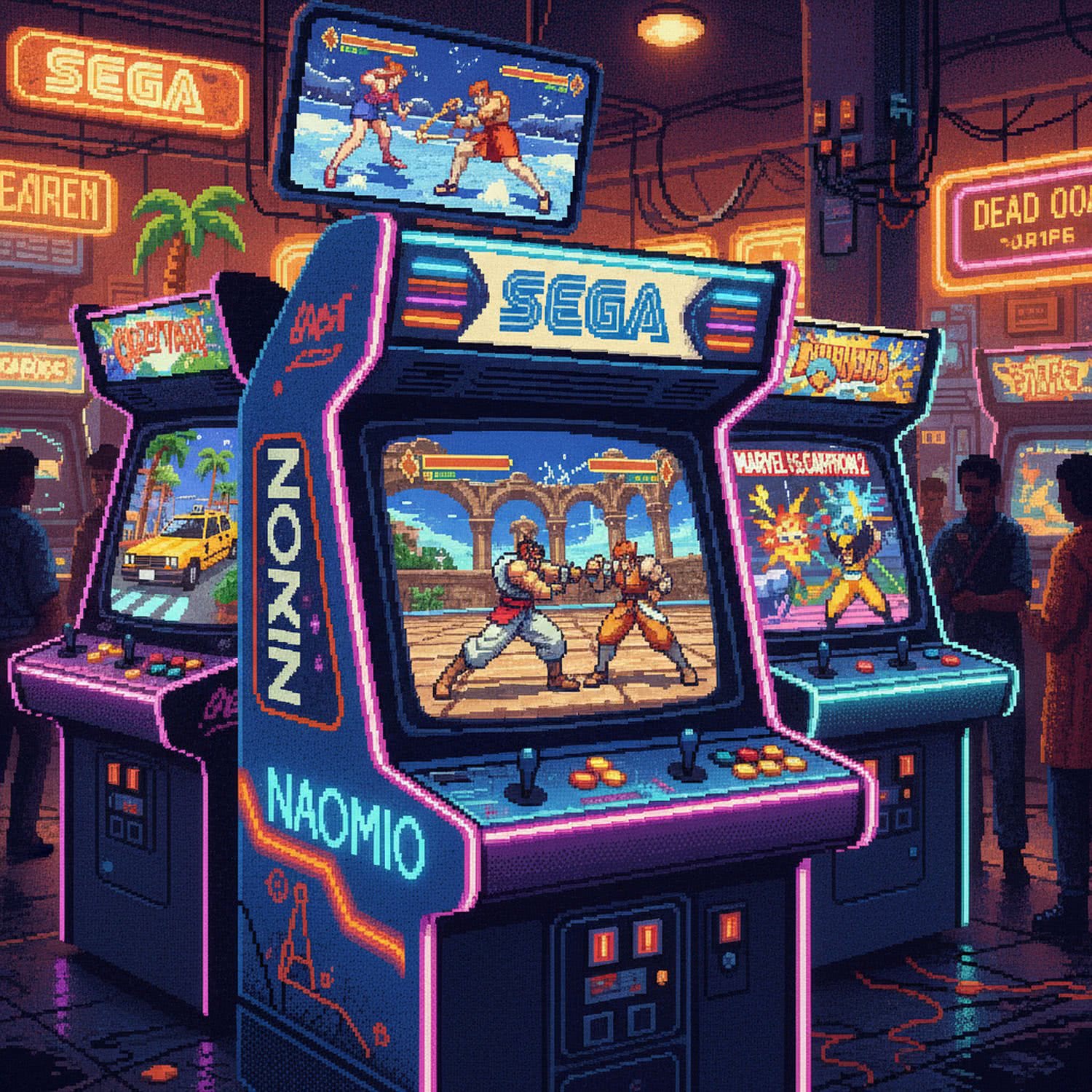 Retro game and console pixelart illustration: A vibrant retro arcade scene from the late 1990s, featuring a glowing NAOMI arcade cabinet in the center with Sega branding and neon lights, displaying a dynamic in-game moment from SoulCalibur with 3D fighters battling on a detailed arena. Surrounding the cabinet are elements from iconic NAOMI games: Crazy Taxi racing through San Francisco streets, Marvel vs. Capcom 2 characters unleashing combo attacks, and Dead or Alive 2 with interactive environments. In the background, a bustling arcade hall with coin slots, CRT monitors, JAMMA wiring hints, and excited players inserting coins, evoking the golden age of arcade gaming with warm neon hues, high-energy action, and technical details like PowerVR graphics rendering subtle polygons and particle effects. Style: illustrative digital art in a nostalgic pixel-blended realism, 640×480 resolution vibe, high contrast and saturation. ;;Use a retro video game screenshot style, retro vivid color palette, retro pixel-art elements.