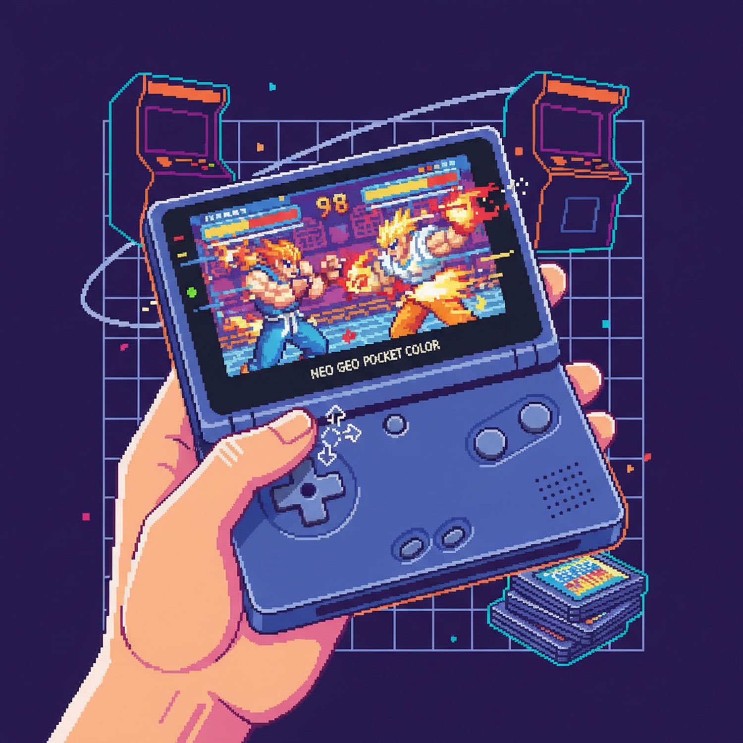 Retro game and console pixelart illustration: A vibrant retro-style illustration of the Neo Geo Pocket Color handheld console, held in a player’s hand during an intense arcade fighting game session. The screen displays a dynamic scene from King of Fighters ’98 with colorful sprites of battling characters mid-combo, smooth animations, and particle effects. Highlight the innovative microswitch joystick in action, with precise directional inputs. Surround the console with subtle nostalgic elements like arcade cabinet silhouettes, game cartridges, and glowing pixel art auras, evoking 90s handheld gaming excitement on a clean, compact design. Use a 16-bit color palette with sharp, clear graphics and no artifacts. ;;Use a retro video game screenshot style, retro vivid color palette, retro pixel-art elements.