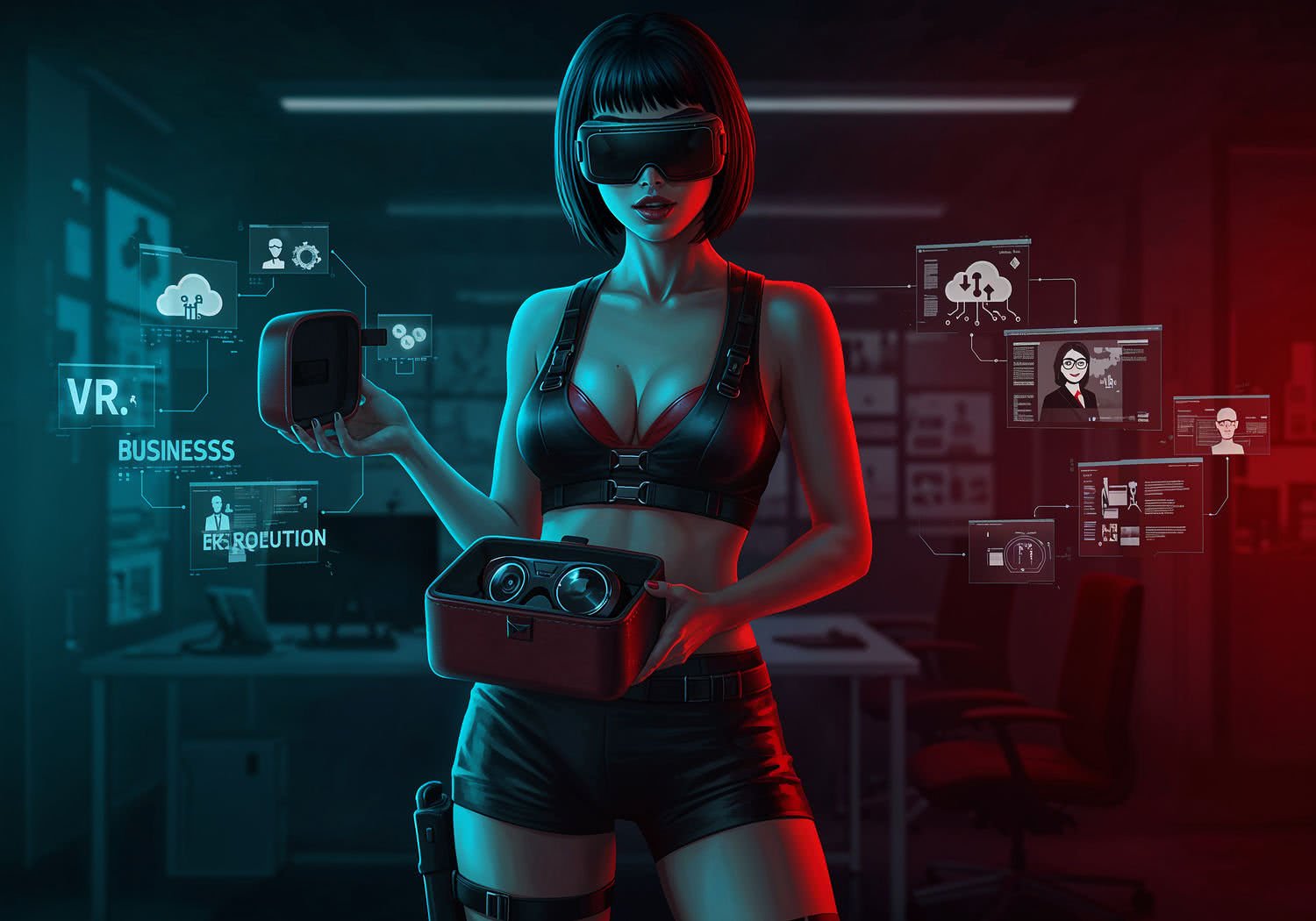 Strong shadows with deep contrast, detailed expressive anatomy and gritty look of woman – she explains and presents: Elegant unboxing of premium VR goggles in a matte leather case, revealing lightweight headset with 4K Fresnel lenses, surrounded by business icons like cloud servers and virtual conference avatars, in a futuristic office setting. The text reads: 'VR Business Revolution Q1 2026′ in large bold comic sans font with bright white fill and black outline. ;The woman is a slim and fit 23-year-old busty european female with black shiny, straight hair and short bangs. Heavy makeup.