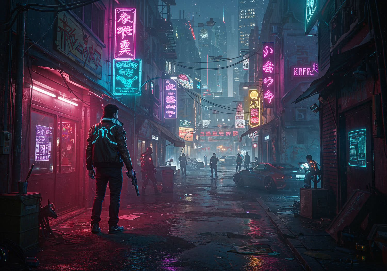 ;; A highly detailed cyberpunk cityscape illustration inspired by Cyberpunk 2077, depicting the expanded Night City from the Unofficial DLC 2 mod. In the foreground, the protagonist V, a cybernetically enhanced mercenary with glowing implants and a jacket, stealthily explores a hidden neon-lit alley in the Watson district, discovering a secret underground weapon shop guarded by street gang members. In the background, extend the scene to show over 50 new locations blending seamlessly: bustling slums with holographic ads, luxurious corporate towers in Westbrook, abandoned buildings with dynamic neon glows, and distant outskirts with rugged terrain and vehicles. Include interactive elements like hacking interfaces on walls, tactical AI enemies lurking in shadows, and easter eggs such as hidden quest markers. The atmosphere is immersive and gritty, with rain-slicked streets reflecting vibrant pink, blue, and purple neon lights, foggy night air, flying cars overhead, and a sense of endless exploration and moral choices. Render in a realistic digital art style matching CD Projekt RED’s game visuals: high contrast, cinematic lighting, intricate details on cyberware and architecture, ultra-detailed textures, 4K resolution, epic and atmospheric composition. ;;