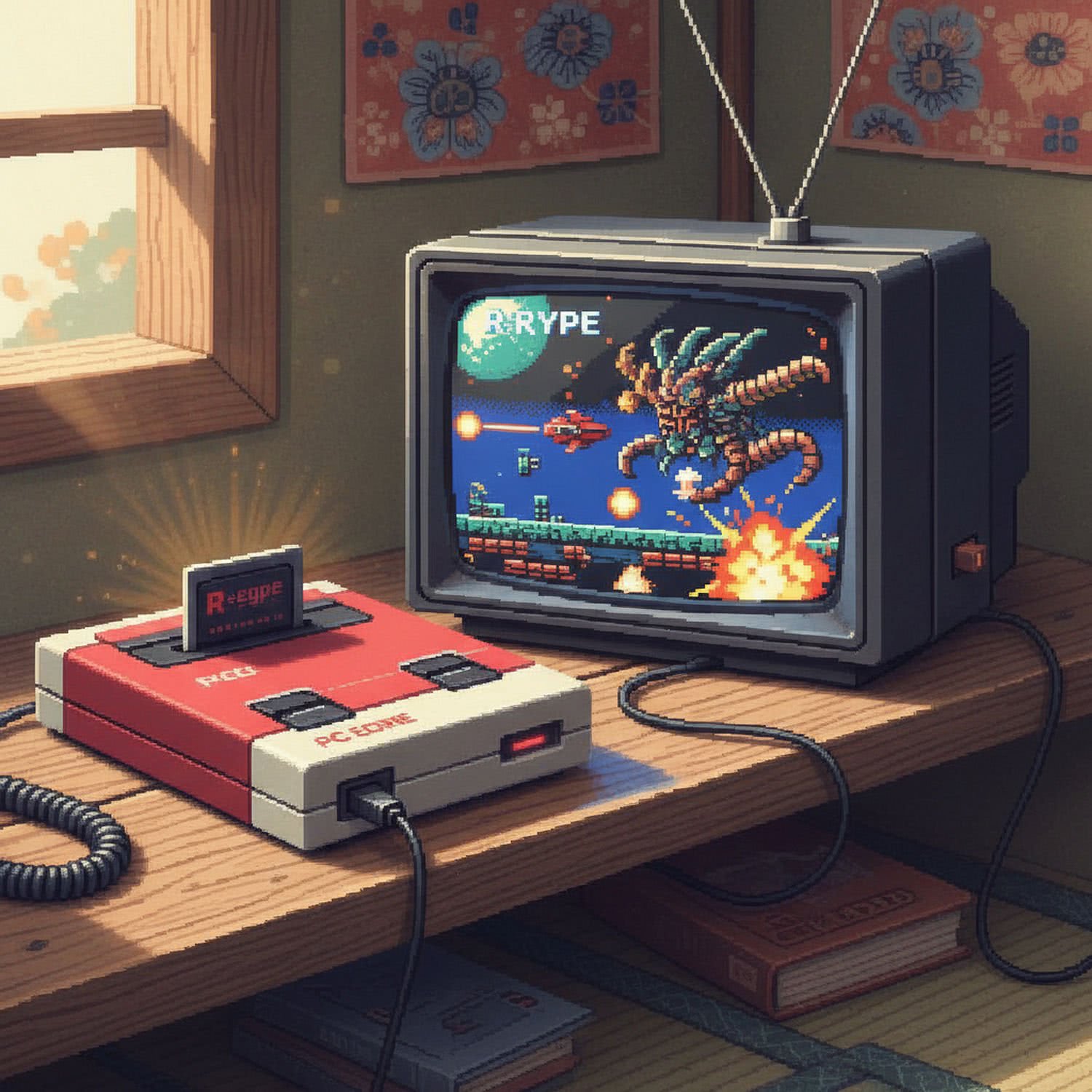 Retro game and console pixelart illustration: A highly detailed digital illustration of the classic PC Engine retro gaming console from 1987, depicted in a compact, book-like horizontal design with its signature red and white color scheme, a coiled controller cable attached, and a thin HuCard cartridge inserted into the slot. The console sits on a wooden shelf in a nostalgic 1980s Japanese living room, connected via RF cable to a small CRT television screen displaying a vibrant 16-bit game scene from R-Type: a dynamic side-scrolling shooter with colorful sprites of a spaceship battling intricate alien bosses, smooth scrolling backgrounds, and explosive effects in a palette of 482 vivid colors. Subtle glows and pixelated edges evoke the era’s revolutionary graphics, with soft warm lighting highlighting the console’s portability and innovative charm, in a retro-futuristic style blending realism and pixel art influences. ;;Use a retro video game screenshot style, retro vivid color palette, retro pixel-art elements.
