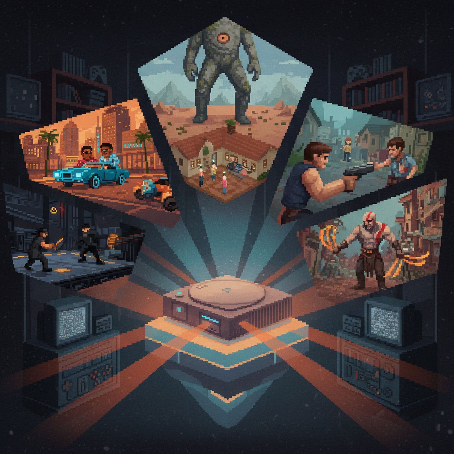 Retro game and console pixelart illustration: A vibrant, nostalgic illustration of the iconic PlayStation 2 console centered on a glowing pedestal in a retro gaming room, with ethereal beams of light projecting holographic scenes from legendary PS2 games surrounding it: a sprawling open-world cityscape from Grand Theft Auto: San Andreas with a gangster character driving through neon-lit streets; a stealthy agent sneaking through shadowy industrial platforms from Metal Gear Solid 2; a cozy suburban house with customizable Sims characters interacting inside; a tense over-the-shoulder view of a survivor battling grotesque zombies in a misty village from Resident Evil 4; a muscular Spartan warrior wielding chained blades slashing at mythical beasts from God of War; and a lone rider climbing the massive, crumbling body of a colossal stone giant in a vast, empty wasteland from Shadow of the Colossus. Render in a mix of realistic PS2-era graphics and modern digital art style, with warm orange and blue tones evoking 2000s nostalgia, dynamic composition emphasizing innovation and legacy. ;;Use a retro video game screenshot style, retro vivid color palette, retro pixel-art elements.