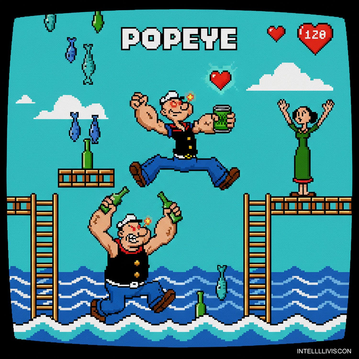 Retro game and console pixelart illustration: A vibrant retro pixel art illustration of Popeye the Sailor Man in action on the Intellivision console game, jumping across colorful platforms and ladders in a portside scene with waving sea waves and floating clouds in the background. Popeye, muscular with pipe and anchor tattoo, is mid-jump collecting a floating heart while holding a can of spinach, powering up with glowing eyes; Brutus chases aggressively from below throwing bottles, and Olive Oyl waves from a higher platform. Include falling fish obstacles and a heart-shaped timer in the corner, evoking 1980s arcade nostalgia with 16-color palette, 8-bit sprites, and smooth animations like the original game’s style. ;;Use a retro video game screenshot style, retro vivid color palette, retro pixel-art elements.