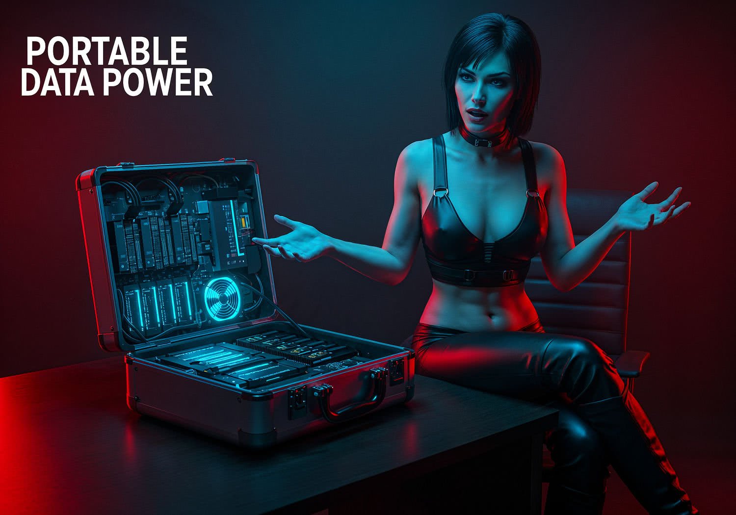 Strong shadows with deep contrast, detailed expressive anatomy and gritty look of woman – she explains and presents: A sleek, futuristic aluminum suitcase opened on a modern office desk, revealing a compact interior packed with glowing blue SSD drives, modular ARM processors, cooling fans, and high-tech cables, evoking a portable data center ready for business use in any location. The text reads: 'Portable Data Power’ in large, bold comic-style font with bright white letter centers and thick black outlines. ;The woman is a slim and fit 23-year-old busty european female with black shiny, straight hair and short bangs. Heavy makeup.