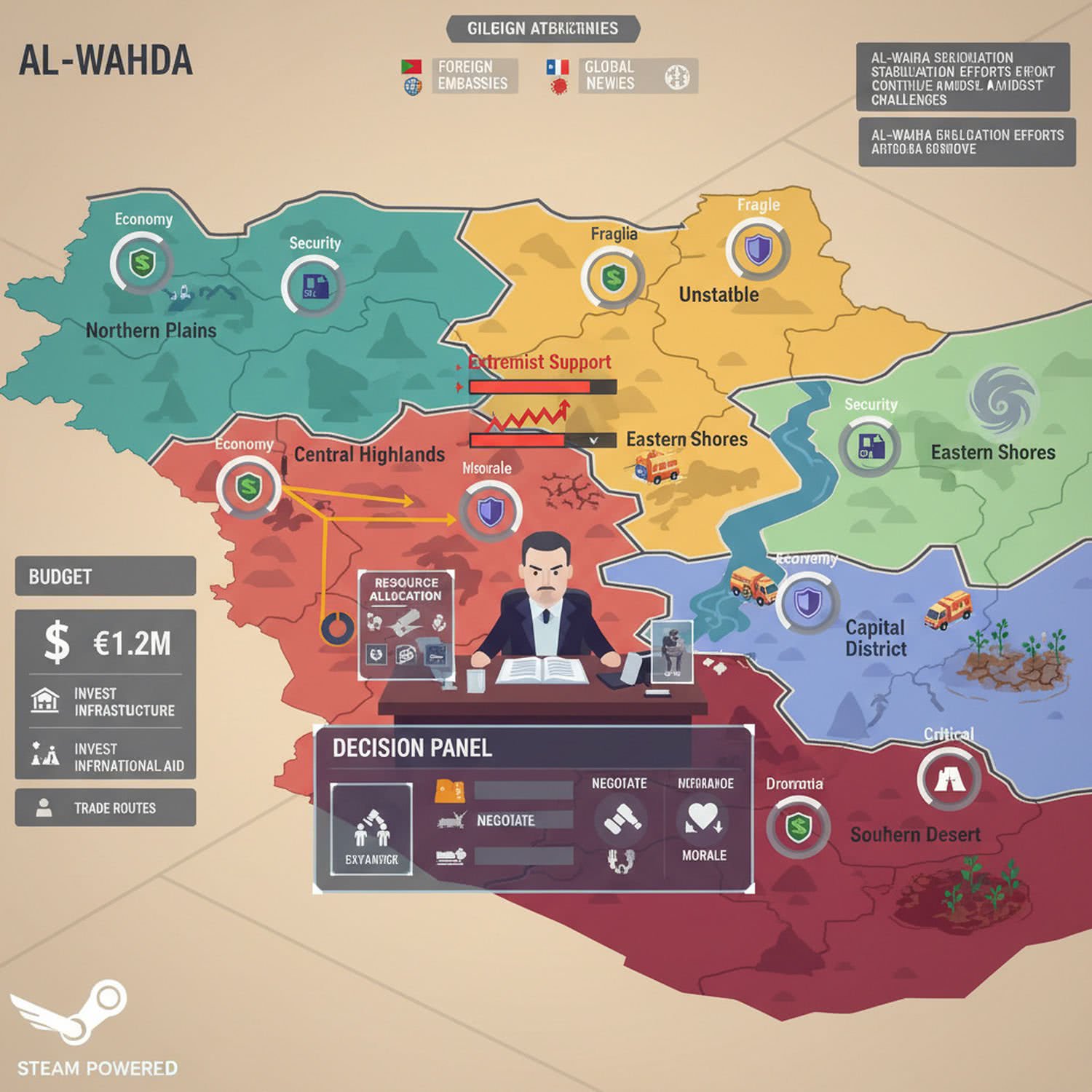 Gra rozgrywa się w różnych regionach fikcyjnego świata, inspirowanych realnymi konfliktami, takimi jak te w Bliskim Wschodzie czy Afryce. Twoim celem jest osiągnięcie stabilności poprzez zrównoważone decyzje: inwestycje w infrastrukturę, walkę z korupcją, negocjacje z rebeliantami i radzenie sobie z presją międzynarodową. Mechanika opiera się na systemie governorów – wybierasz lidera z unikalnymi umiejętnościami, co wpływa na tempo gry. Na przykład, w trybie kampanii musisz balansować między stabilnością, gospodarką a bezpieczeństwem, unikając wzrostu poparcia dla ekstremistów.