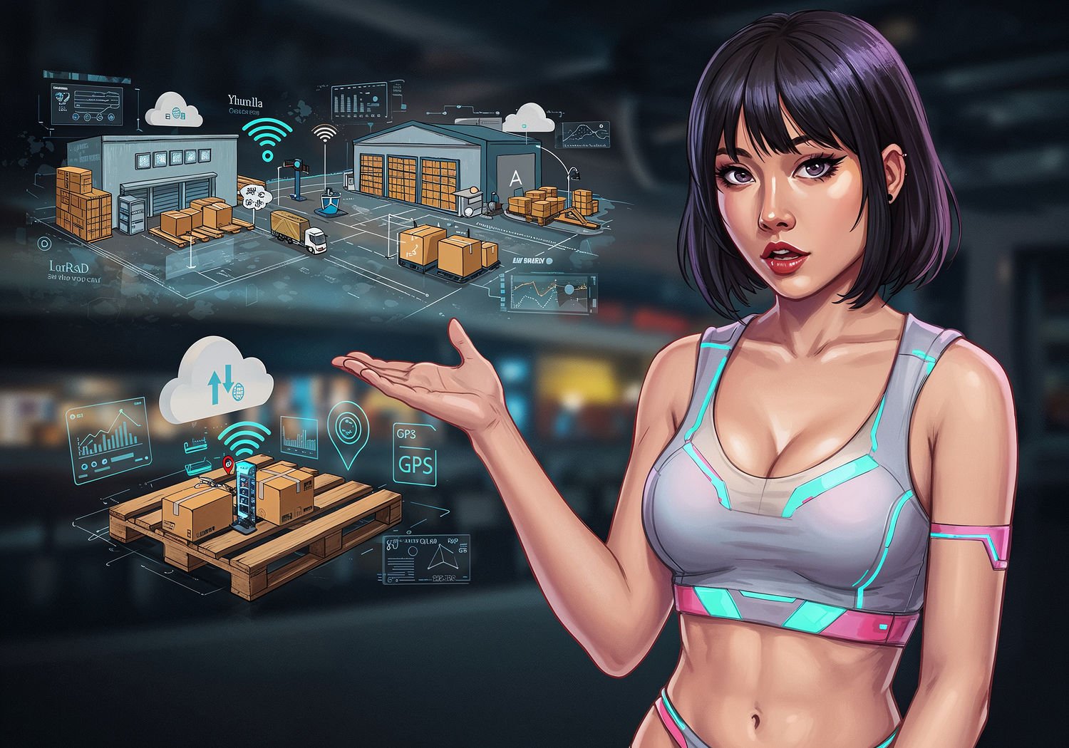 She is explaining and presenting the: A dynamic illustration of pallets equipped with LoRa sensors being tracked in real-time across a global supply chain, showing warehouses, ports, trucks on roads, and data flowing to cloud dashboards with icons for temperature, shocks, and GPS location. The text reads: 'LoRa Logistics Revolution’ in large, bold comic-style font with bright white letter centers and clear black outline. ;;Asian Thai cute woman with short, straight black hair some grunge twist, a bold vivid make-up, dark anime-large expressive eyes, a pale and gloss lipstick, a confident and edgy smirk;