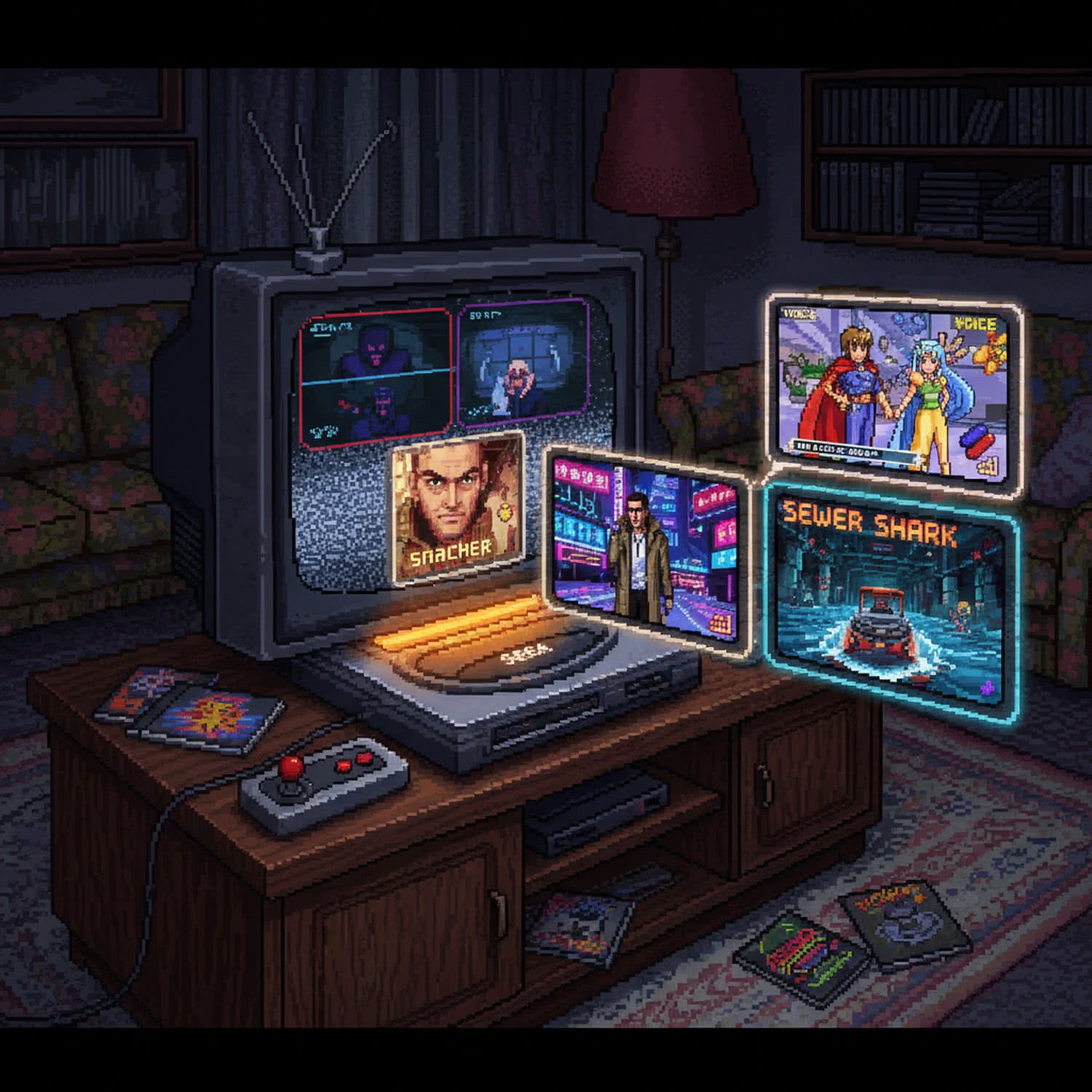 Retro game and console pixelart illustration: A vibrant retro-futuristic illustration of the SEGA CD add-on attached to a Sega Genesis console on a wooden TV stand in a 90s living room, with glowing full-motion video screens emerging from the CD drive displaying iconic game scenes: Night Trap’s surveillance cameras capturing vampire-like figures in a dark house, Lunar’s fantasy RPG hero Alex and princess Luna in an animated cutscene with voice acting bubbles, Snatcher’s cyberpunk detective in a neon-lit Neo Kobe cityscape, and Sewer Shark’s high-speed boat chase through flooded sewers. The console pulses with warm orange light, surrounded by scattered CD jewel cases and a joystick, evoking innovation and nostalgia in pixelated 16-bit style blended with cinematic FMV realism, high contrast, dynamic composition. ;;Use a retro video game screenshot style, retro vivid color palette, retro pixel-art elements.