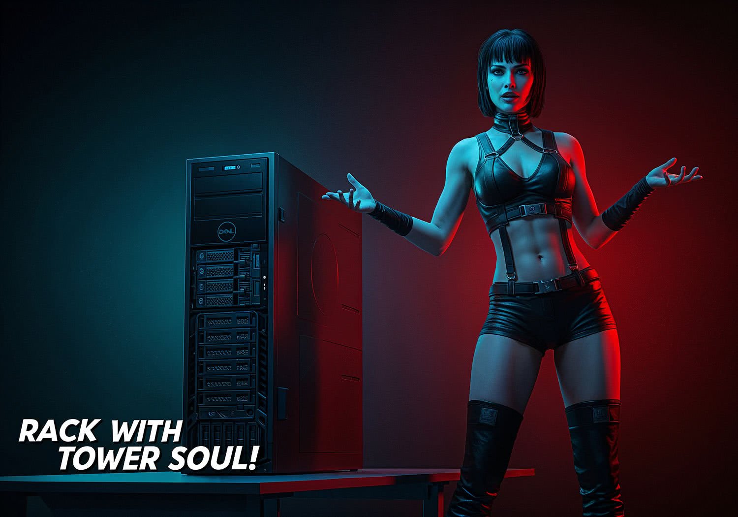 Strong shadows with deep contrast, detailed expressive anatomy and gritty look of woman – she explains and presents: A compact Dell PowerEdge R260 server mounted in a shallow 1U rack enclosure, with subtle tower-like elements like quiet fans and easy-access panels, transforming seamlessly into a standalone tower on a desk, illustrating hybrid flexibility for office and data center use. The text reads: 'Rack with Tower Soul!’ in large bold comic-style font with bright white fill and black outline. ;The woman is a slim and fit 23-year-old busty european female with black shiny, straight hair and short bangs. Heavy makeup.