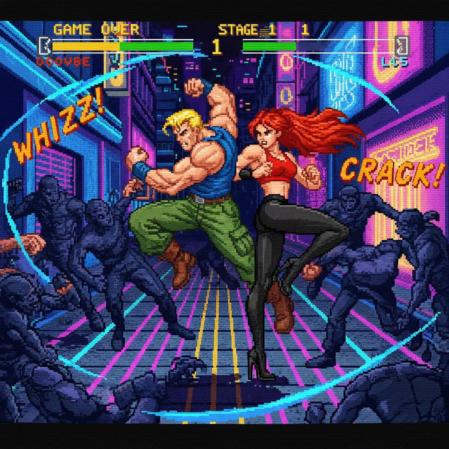 Retro 16bit game and 16bit console fanart: Dynamic illustration of Axel Stone and Blaze Fielding from Streets of Rage, standing back-to-back in a neon-lit urban street of Wood Oak City at night, fighting off a group of shadowy gang members with powerful punches and kicks. Axel, muscular with slicked-back blond hair, wears a blue shirt with rolled sleeves, cargo pants, and boots, delivering a grand uppercut. Blaze, athletic redhead with flowing hair, in a red tank top, black pants, and high boots, performs a spinning kick. Pulsing techno lights and bass waves in the background, 90s retro style with vibrant pixels and energetic motion, evoking Sega Mega Drive beat ’em up action. ;;Use a 16bit retro video game screenshot style, 16bit retro vivid color palette, 16bit retro pixel-art elements and CRT effects.