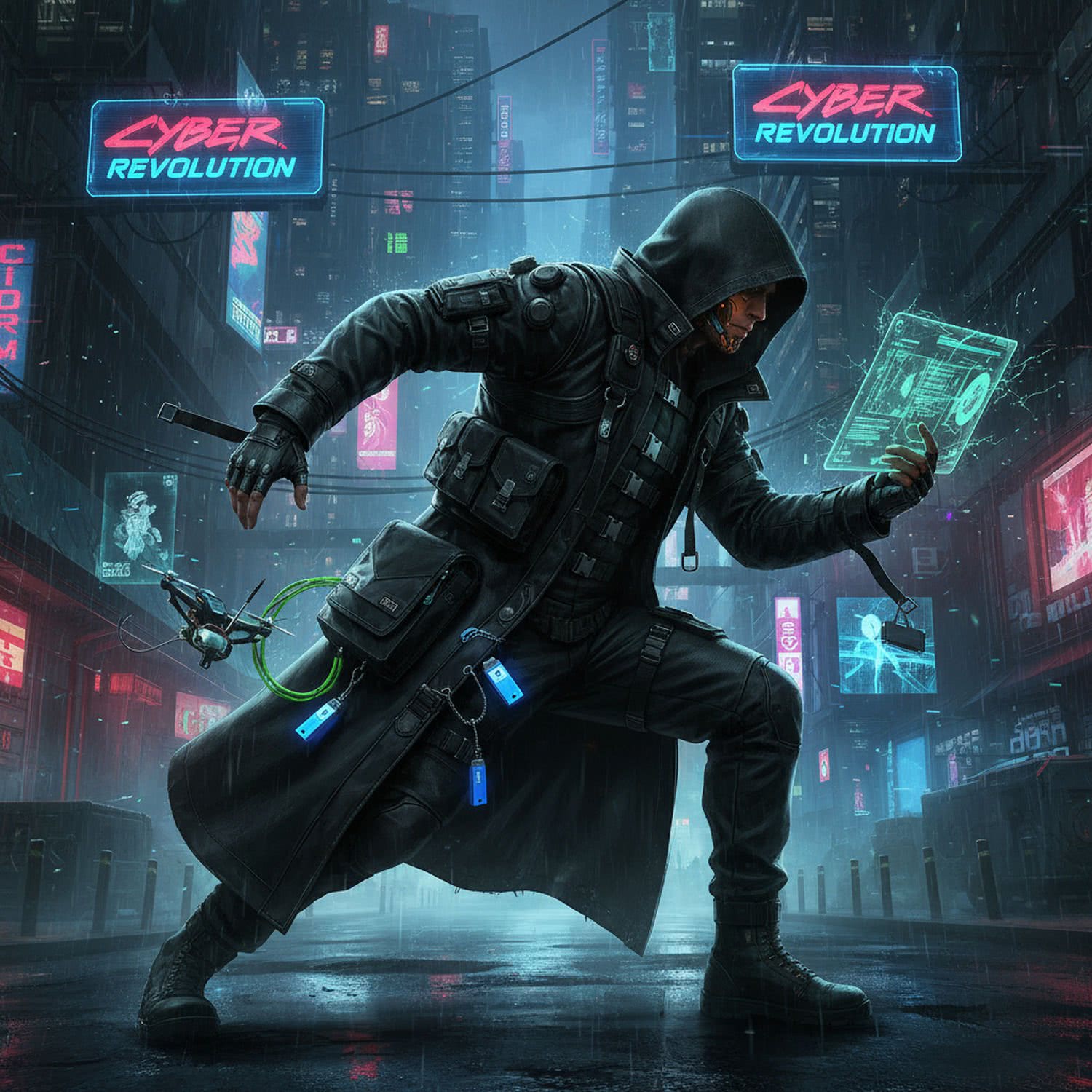 videogame screenshot, action capture screen, extreme dynamic poses, vibrant videogame color palette: A highly detailed digital illustration in a cyberpunk style, featuring a lone hacker protagonist standing in a neon-lit urban alleyway at night, embodying techwear aesthetics. The hacker is a shadowy figure with a hooded black trench coat jacket covered in numerous modular pockets, adjustable straps, buckles, and tactical elements like magnetic closures and reinforced seams, inspired by Acronym designs. The jacket has at least a dozen visible pockets stuffed with gadgets like USB drives, a mini-drone, and cables dangling subtly. The hacker holds a glowing holographic tablet displaying cascading green code and network diagrams, with one hand adjusting a strap on the sleeve. Their face is partially obscured by the hood and a subtle cybernetic augment on the jawline, evoking characters like Adam Jensen from Deus Ex. The background shows a dystopian cityscape with towering skyscrapers, flickering neon signs in blues, pinks, and reds reading „Cyber Revolution” and holographic ads, rainy streets reflecting lights, and faint digital glitches in the air. Dark, moody color palette dominated by blacks, grays, and metallic tones, with vibrant neon accents for contrast, in a realistic yet futuristic rendering with high contrast, sharp details, and atmospheric fog to symbolize digital infiltration and rebellion. ;;Image without icons or texts. Style: videogame screenshot, action capture screen, clean digital coloring with sharp highlights, high energy and contrast.