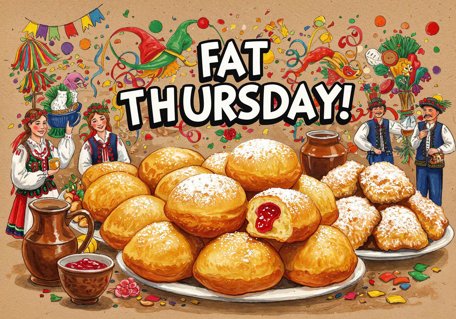 The background is partially removed and replaced with a light brown watercolor background on cardboard with a soft feel. A festive Polish table overflowing with golden paczki filled with rose jam and crispy faworki dusted in powdered sugar, surrounded by colorful folk patterns, confetti, and joyful people in traditional attire celebrating Fat Thursday. The text reads: 'Fat Thursday!’ in large bold comic sans font with white fill and black outline. ;