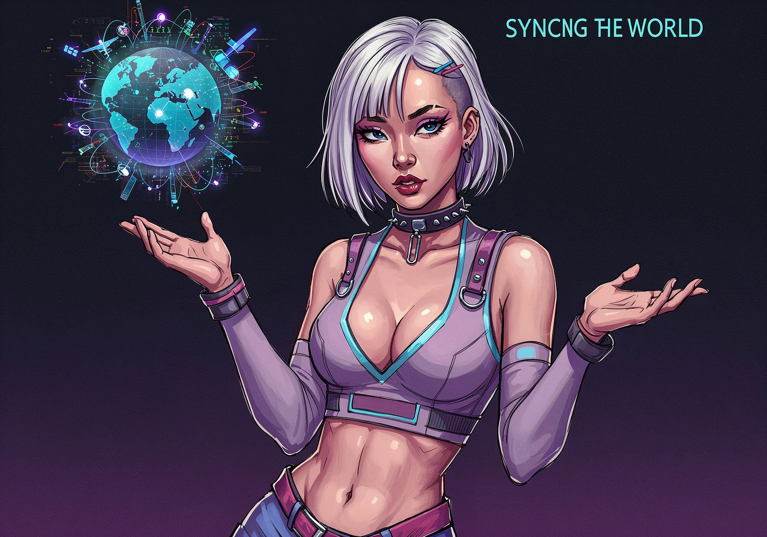 She is explaining and presenting the: A futuristic globe encircled by glowing radio waves and electromagnetic signals emanating from atomic clocks, GPS satellites in orbit, and radio towers like DCF77, synchronizing digital clocks, smartphones, financial servers, and global networks below, in a high-tech, precise and interconnected style. The text reads: 'Syncing the World’ in large bold comic sans font with bright white fill and black outline. ;;Asian Korean woman with short, straight platinum-blonde hair with colorfull edges and some punk twist, a bold vivid cat-eye liner, dark, anime-large expressive eyes, a deep nude and gloss lipstick, a confident and edgy smirk;