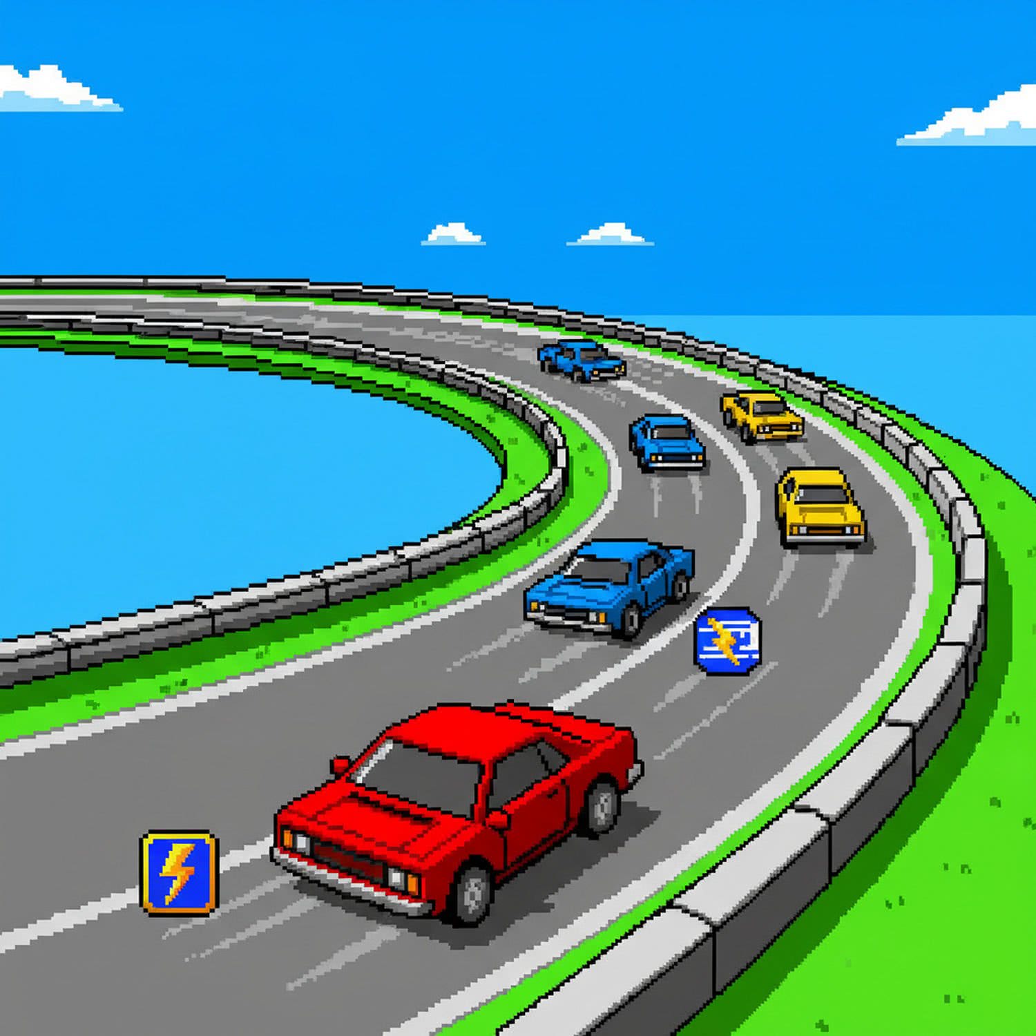Retro game and console pixelart illustration: A retro pixel art illustration in 8-bit style of a top-down racing scene from the 1983 Sega SG-1000 game Zippy Race, featuring a red sports car speeding along a winding asphalt track with green grass borders and gray barriers, pursued by blue and yellow opponent cars, scattered power-up icons like nitro boosts on the road, vibrant colors with a blue sky background, evoking 1980s arcade nostalgia and fast-paced action. ;;Use a retro video game screenshot style, retro vivid color palette, retro pixel-art elements.